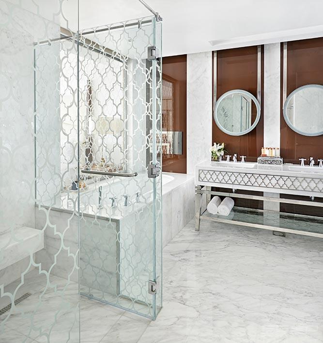 明亮、现代的房间装潢,却透露出一丝古典的气味。浴间玻璃门上的古典图饰与盥洗台呼应,有趣又耐看。圆形和方形的对比颇有巧借“天圆地方”的神韵,白色大理石的主调让整个空间显得干净大气。