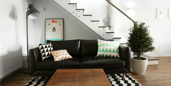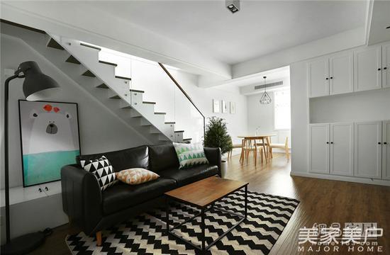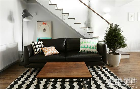 在布置方面用黑、白、土黄、绿色几何图案的地毯、靠垫等装点轻松、跳跃的北欧居室氛围。宜家的落地灯、黑色皮质沙发等都属于比较暗的色系,但是搭配后面墙上的卡通挂画,一下子让整个家温馨起来。