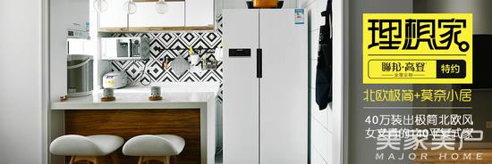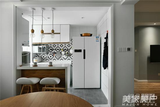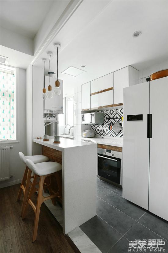 厨房做成了半开放式,设计师把烟机灶具放到了厨房原来的小阳台的位置,将中西分厨。并利用了门套的厚度,做了一个小吧台,早晨吃个早饭,办个水果沙拉什么的非常方便。