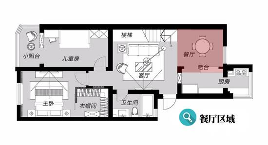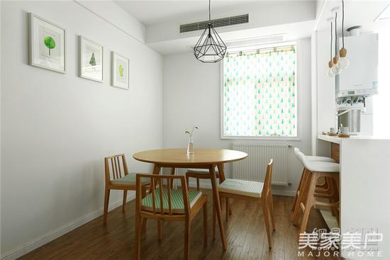 面积为正方形的餐厅适合放置圆桌,吧台也可作为简易的就餐场所。
