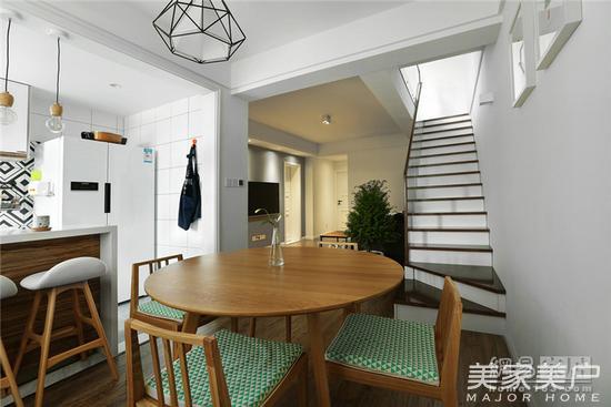 楼梯上方有个采光很好的阳台,借助楼梯洞带给餐厅带来光源。