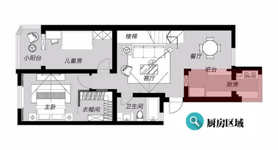 厨房为狭长形,右侧的一小处空间原本为阳台。
