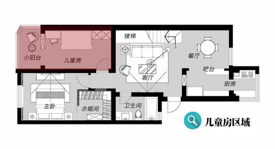 儿童房与主卧面积相当,也为狭长形,进深较小,带有一个小阳台。