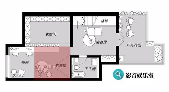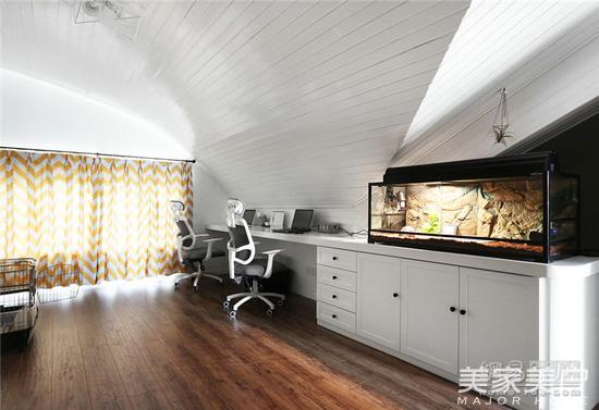 影音室在书房旁边,由于阁楼的倾斜屋顶使得空间较难利用,而且比较危险。