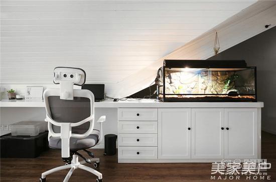 地柜上放了一个龟箱,整个二楼就是书房和小动物的天地,我们的业主非常喜欢养小动物,有乌龟,鹦鹉,垂耳兔,还有一只哈士奇。
