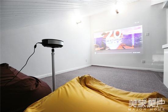 书桌对面做了一个影音室,利用斜顶高的一面做了投影墙,斜顶低的一面放上懒人沙发。一个休息的午后,或者是夜晚,两个人,一群小动物,一部电影,还有什么比这更幸福。