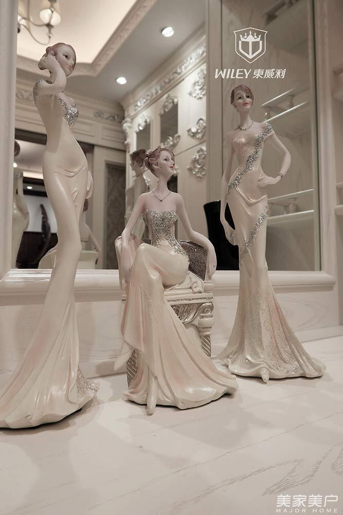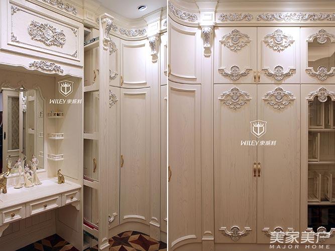 珍珠白的衣帽间采用半开放加银光纹的油漆工艺,使得粗犷木纹在光照下有一种闪银的质感。柜门上的法式雕花件做了擦银效果,更是让衣柜整体看上去充满法式的奢华尊贵。