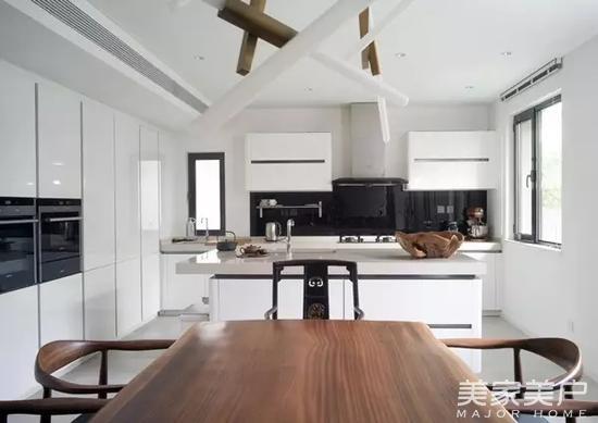 如果饮食习惯偏重口、油烟太多的话,在厨房设计上可以考虑这种半开放式的厨房。半开放式和开放式功能几乎一致,并在阻隔油烟的功能上更胜一筹。通过玻璃墙或推拉门的隔断,让空间变得敞亮的同时也形成了较好的延伸感。