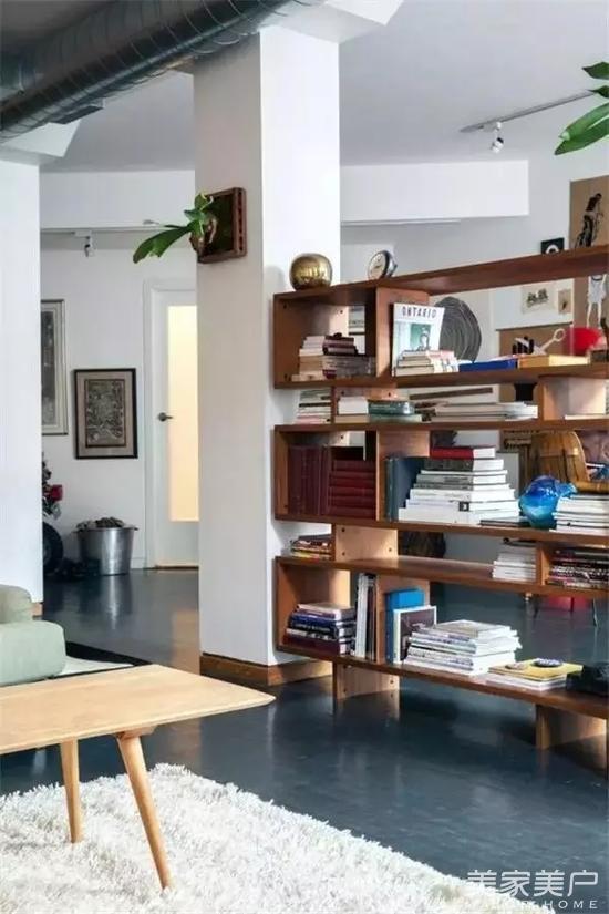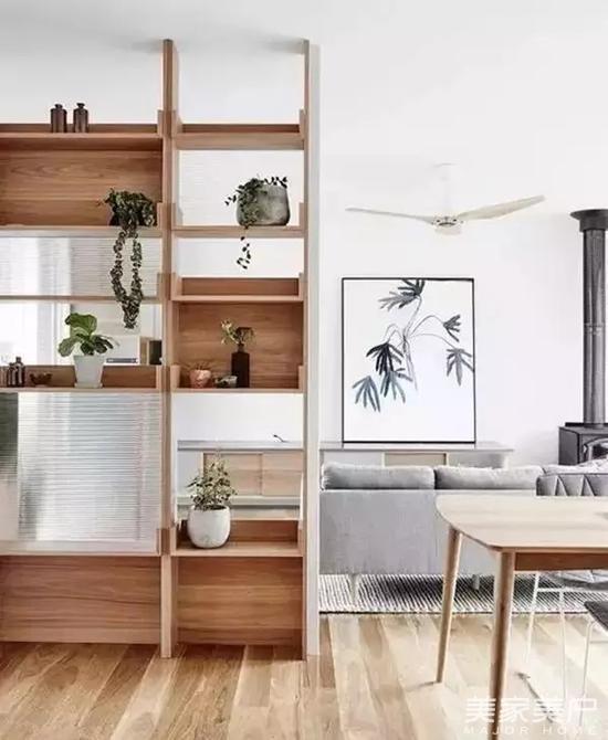 最常见的便是拿书架、置物架来做隔断的设计,装饰收纳两不误,也让空间得到了最大程度的利用。