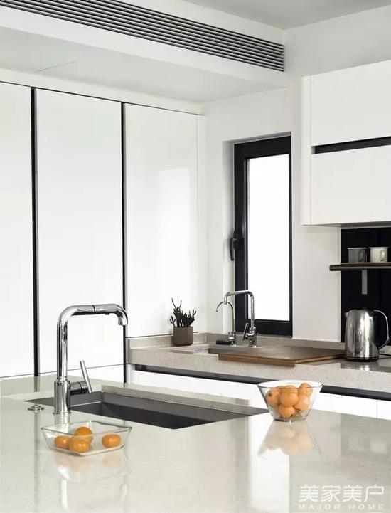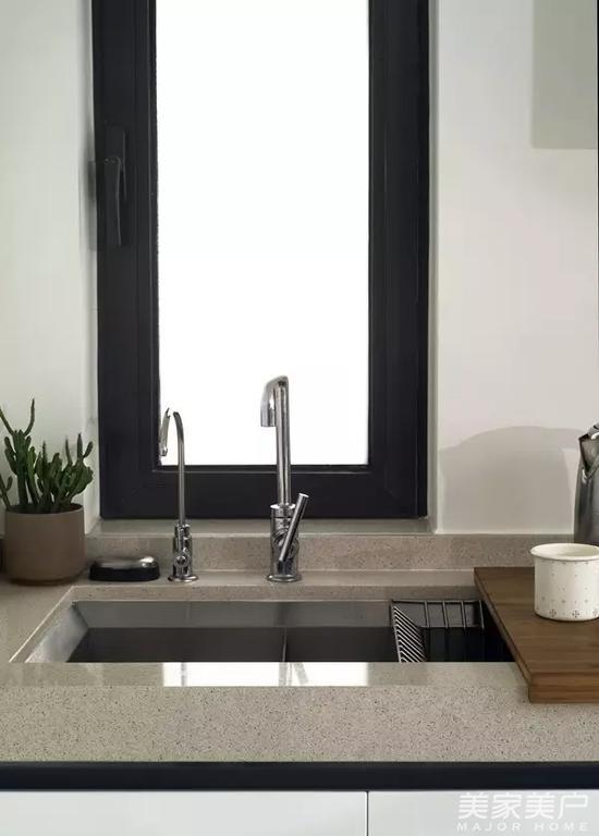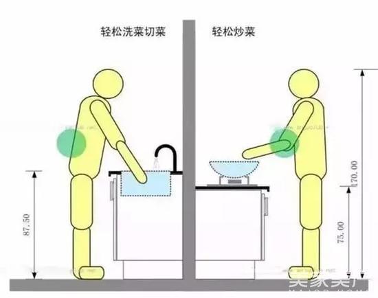 备菜区和烹饪区的高低错层设计,水槽、操作台为高区,燃气灶为低区。这样做更符合人体工学原理,省时又省力。