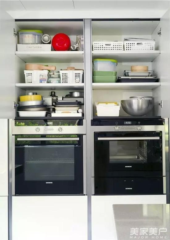 橱柜是厨房收纳最重要的载体,也是最大的存储区域。因此收纳功能必须精细人性化,橱柜的每个柜子的储藏空间都不能浪费,不同的工具有特定的位置去收纳,所有抽屉都可以进行个性化的配置。通过合理安置,让橱柜整齐有序,更美观大气。