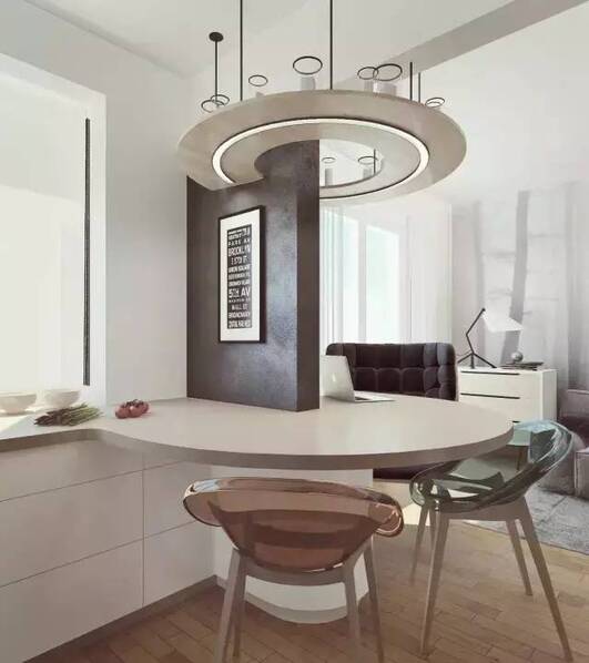 然后就是餐厅和工作台合一的弧形操作台,也兼具着隔断的作用。既有特色,功能性也强,小编觉得家里有条件的可以试试。