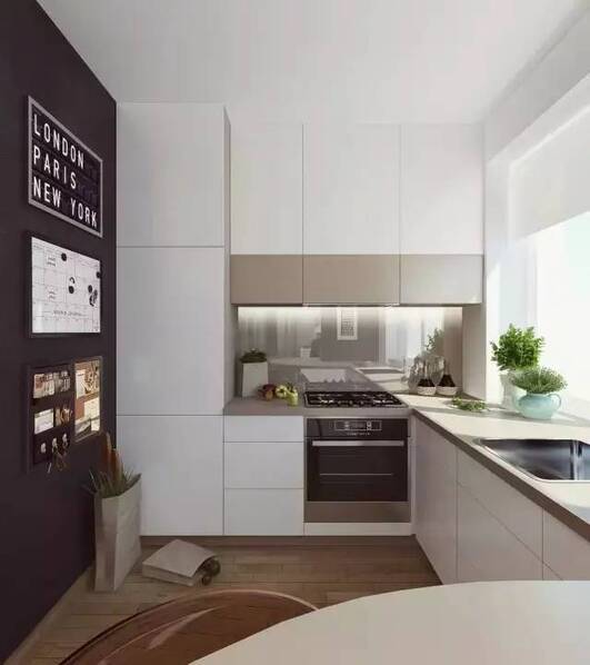 L型的橱柜,这个位置的光线很好,白色的橱柜和黑色的墙面可以形成一个对比,更加显眼。