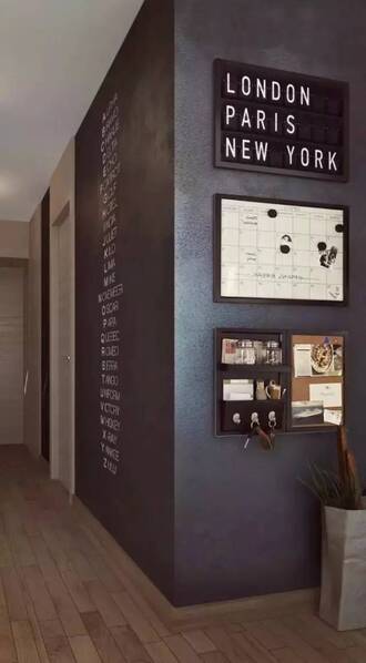 入户玄关,做了一面黑板墙,虽然小编看不懂这些英文字母代表啥意思,但感觉很有趣样子。