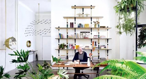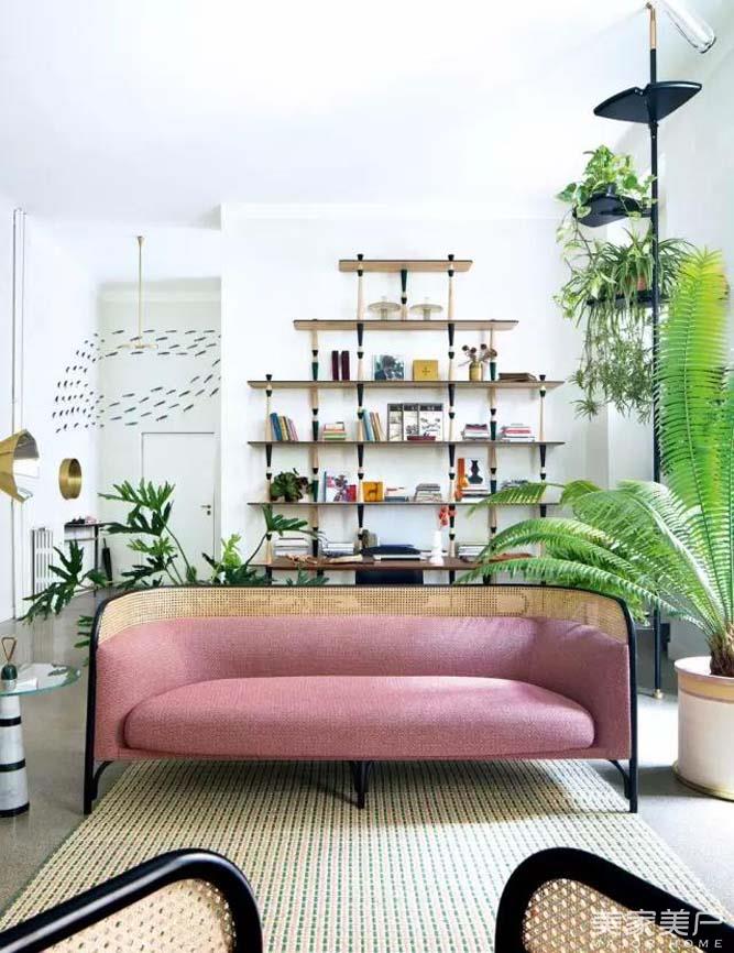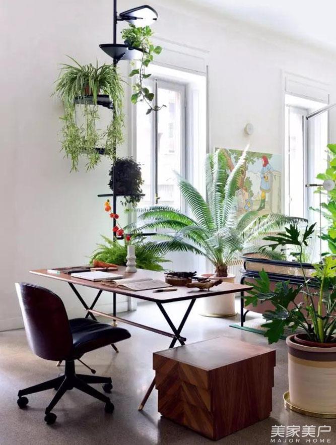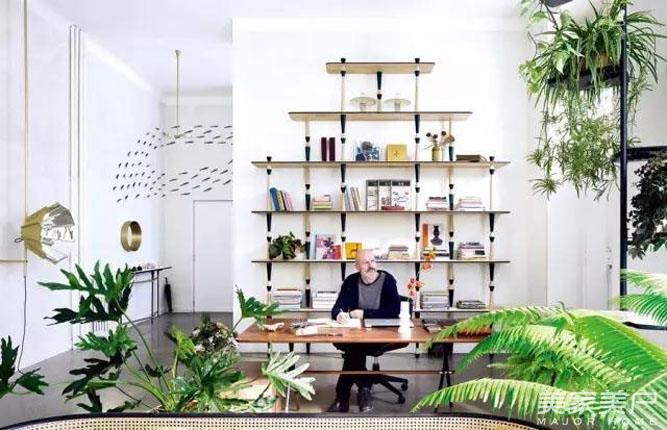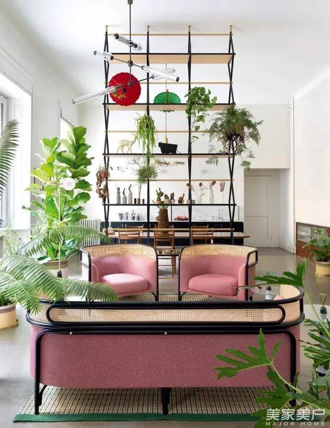 绿色植物环绕的公共区一角,有的绿植置于Ginko Exhibitor搁物架上,接近天花板。搁物架也由主人设计。