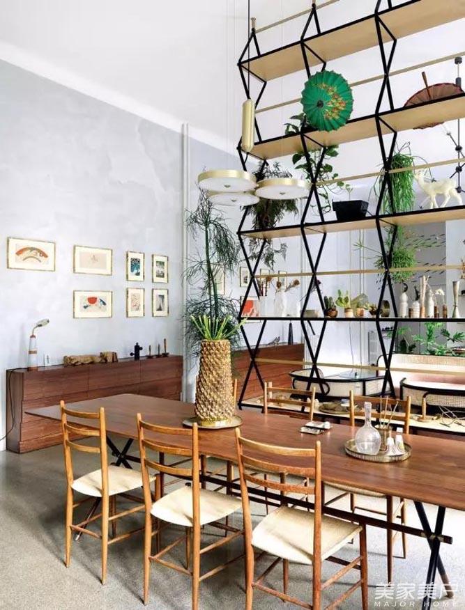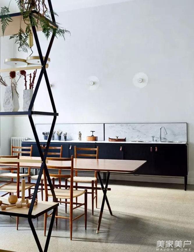 这里没有浓烈的颜色,而是以自然为灵感的粉彩变色。在2017系列中,色调变得简洁而综合,由黑白深浅色主导,引发无限遐想:天蓝色与棕色表达天空与大地;绿色与棕色则用来唤起森林、树枝和树叶。这些都是主人的心头所好。另一种深受喜爱的材料是木材,因为它包含的颜色变化、它的触感的柔软度、它的气味、它的瑕疵,以及它复杂与简单的混合。在装饰方面,那些影响谨慎地混合着:殖民地风格;“SAT”灯具系列的空间度(Pietro Russo设计室);旅行带回的物件、画作,以及独特且朴实的花瓶所携带的种族血统;也有对19世纪的致敬,那些古生物和植物的雕刻;更不用说那些随处可见的绿色植物。从意大利的各个展览以及跳蚤市场淘来的宝贝点缀在家具之中,后者都是由Pietro Russo设计的。他同时也专门为这个地方设计了一些物件,比如Trabea挂式大书架,以及非常适合美食爱好者聚餐的Alma胡桃木桌子。