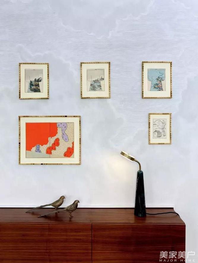面向窗户的墙壁上装饰着具有视觉陷阱效果的云朵图案和一些古老的雕刻画,沿着墙面安装了一套餐具橱。两个橱柜之上,可以看到不同颜色的大理石底座的SAT阅读灯。