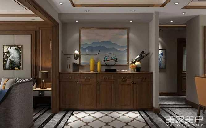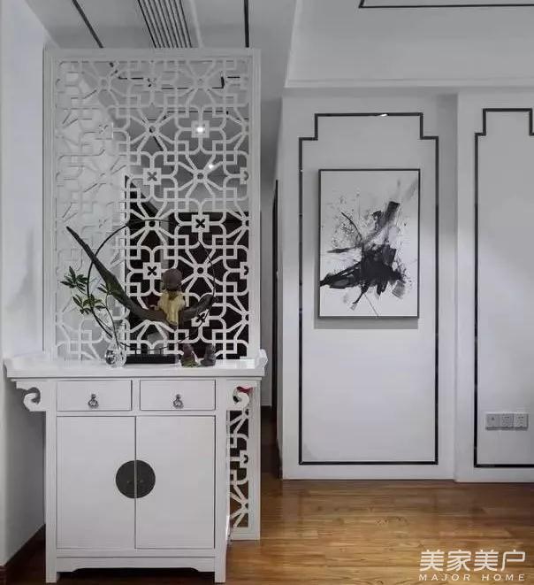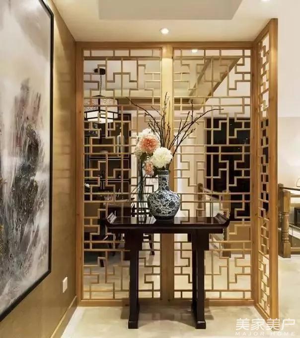中式玄关可摆放屏风进行遮挡,也可放一个雕花案几或者中式的柜子,搭配一些装饰物和挂画,让室内空间充满韵味。