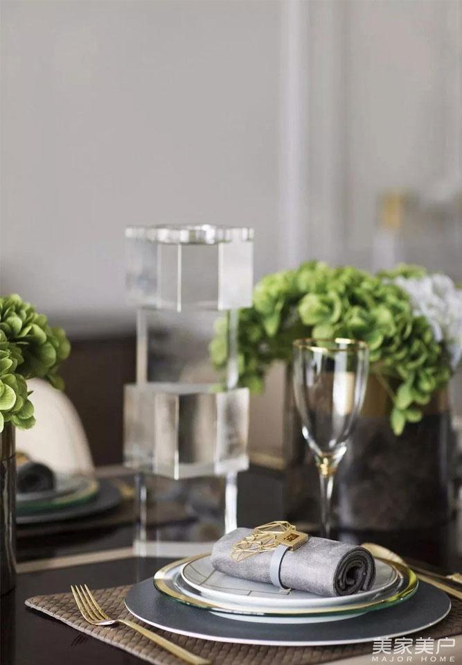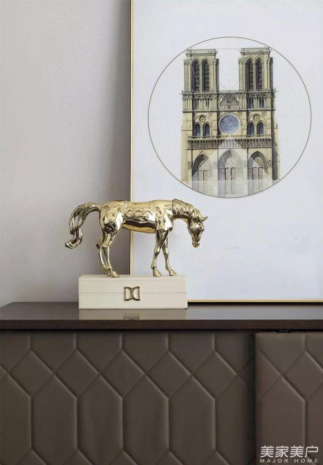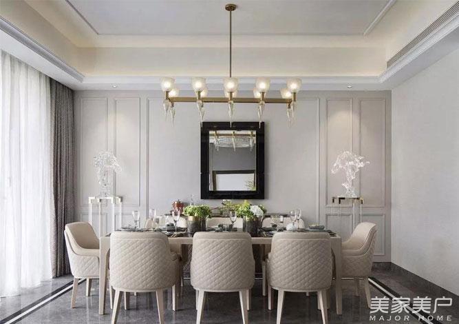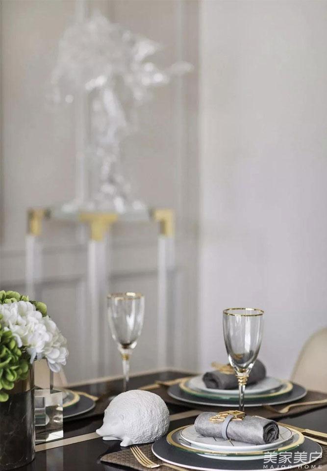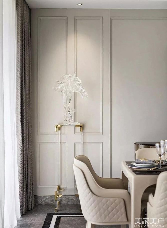 用餐区设计清雅现代,米白色的背景墙以简化的护墙板包裹,左右对称的极简线框,正置中央的黑边镜框,一组水晶造型飞马侍伴左右,共同营造出用餐的仪式美感,现代风的悠然轻灵和欧式的优雅美学于此共同发声。