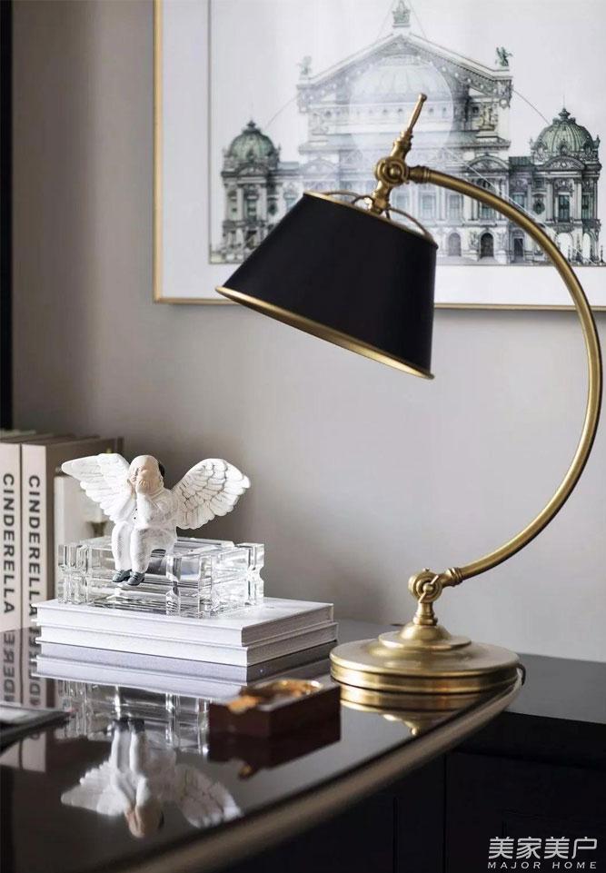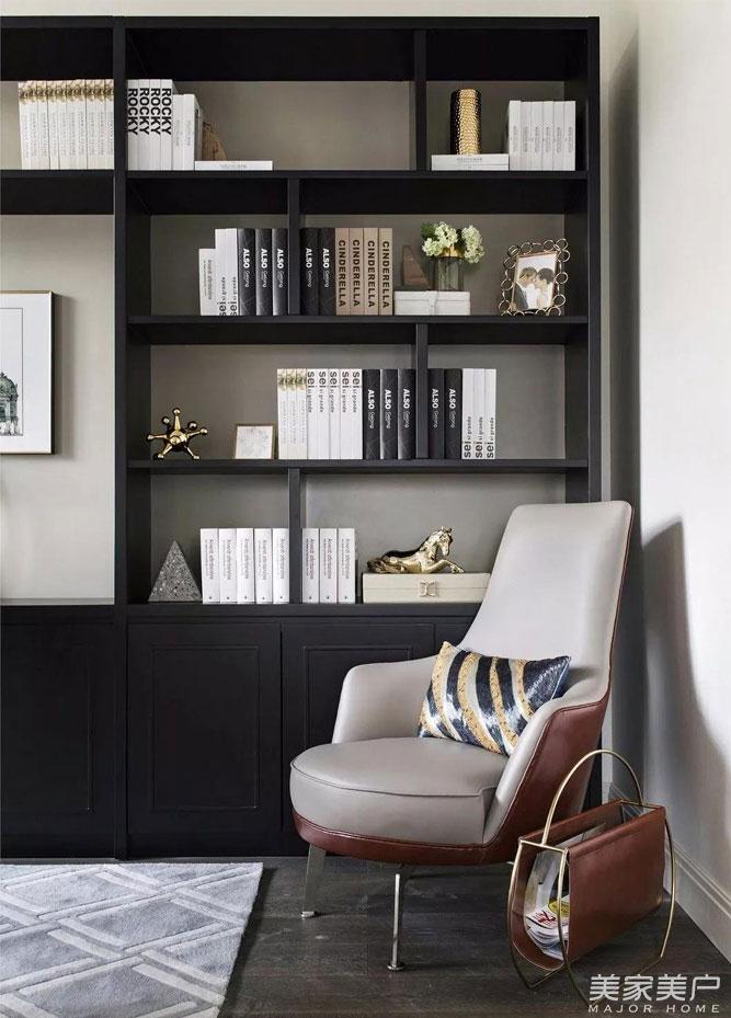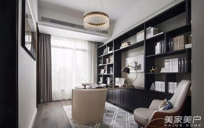 书房设计简约高雅、舒心别致。黑漆书柜铺满整面墙,典雅大气,不经意间释放出理性化的气场与高贵的气息。几何纹路的灰色羊毛地毯,带有一丝高贵的英伦气质,作为过渡色让空间韵律连贯起来。