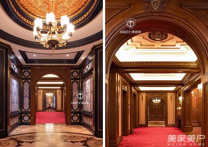 标准欧式长廊设计,在非常有限的空间,通过合理地布局,将吊顶、墙壁加以融合达到整体效果,让过道显得更加大气,豪华。