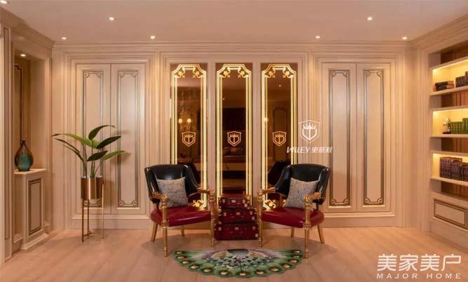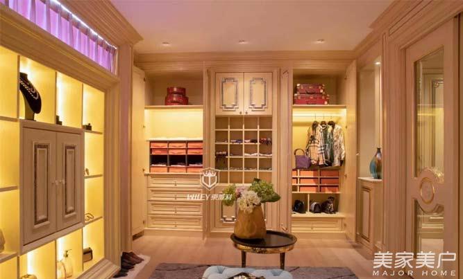 采用温情色开放漆配搭贝壳,银箔点缀,让同一系列产品多样化,衣柜内部釆用爱马仕橙色带收纳功能的皮革,推拉门配套智能化导轨,多元素的完美组合,让空间既充满人性化,也具备了古典与现代地双重审美。