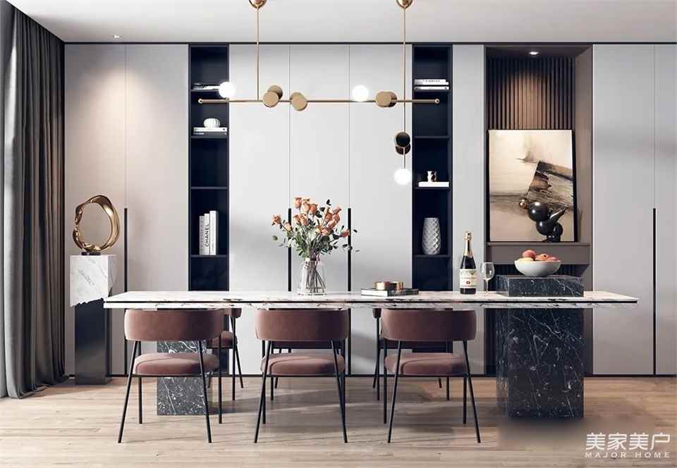 餐厅,在家居空间中地位仅次于客厅,需要兼顾颜值和实用,家的味道就是从这里开始的。餐厅的背景墙重点是营造温馨的进餐氛围,同时考虑结合墙面的储物空间。