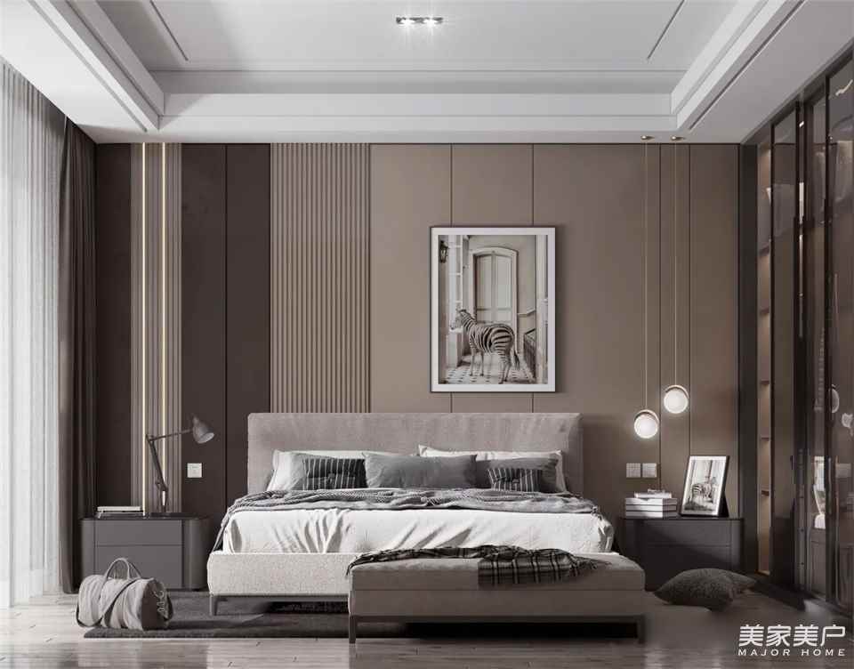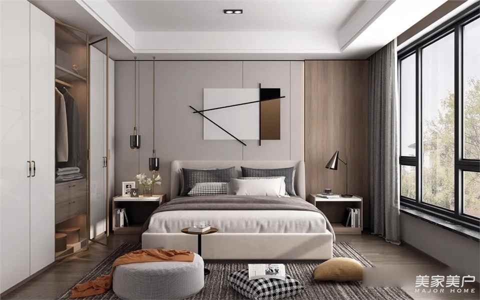 卧室的床头背景墙可以做很多的设计,墙面木质板搭配简约线条,让空间更有层次感,更易入睡。床头再搭配几幅挂画,让卧室看起来更加大气。