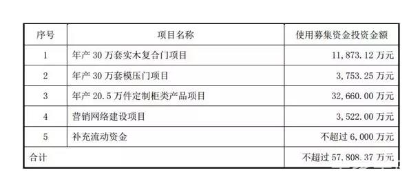 公告透露,本次发行募集资金投资于“年产30万套实木复合门项目”、“年产30万套模压门项目”、“年产20.5万件定制柜类产品项目”、“营销网络建设项目”、“补充流动资金”五个项目,募集资金投资项目达产后,能够缓解产能不足,完善产品结构,为公司战略规划提供基础,增强公司市场竞争力,巩固公司的行业地位。