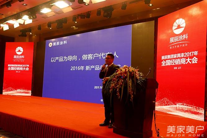 展辰新材料集团股份有限公司总裁孙金平做《紧跟我来》主题演讲,透露了展辰2016年发展状况:2016年展辰集团装修漆业务增长35%,逆势飞扬;家具漆业务增长接近11%。孙金平总裁对展辰集团定位准确,从市场定位、行业标杆,以及营销模型进行阐述,走技术营销之道,一直都是展辰集团坚持的价值模型,展辰集团依靠创新,多赢,将展辰集团打造成为全球化涂料企业。
