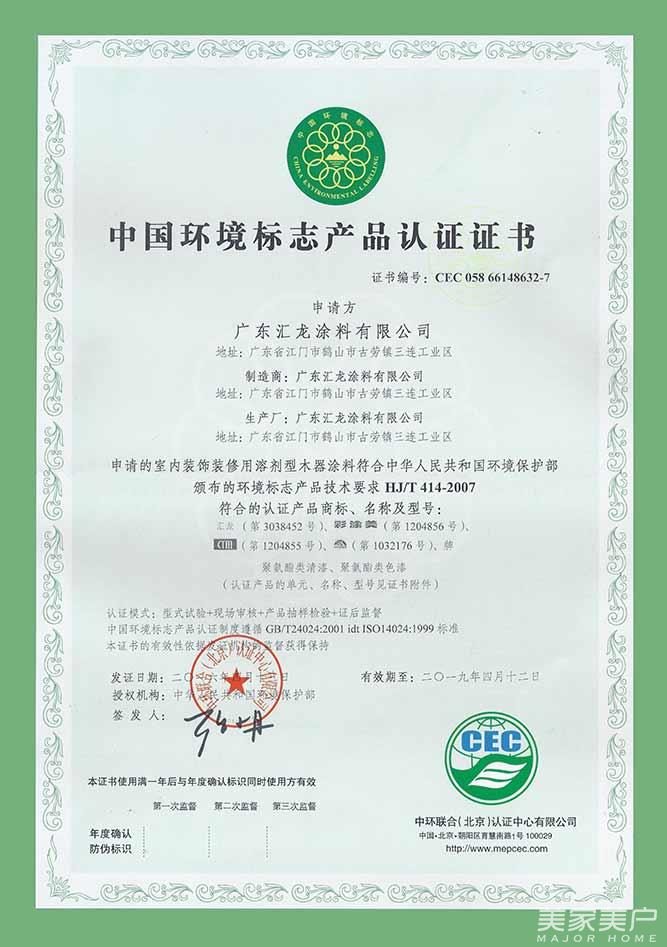汇龙涂料,一直以品质为核心,环保为关键,致力为健康家居提供一站式的环保涂装方案,产品涵盖专业家具漆、专业木器漆、内外墙乳胶漆等多个领域。前沿的技术,一流的研发团队,先进的实验设备,优质的原材料,先进标准的全自动生产系统,严格的质量管理体系等造就了汇龙过硬的产品质量,产品曾先后通过中国环保标志产品、ISO环境质量管理等认证。