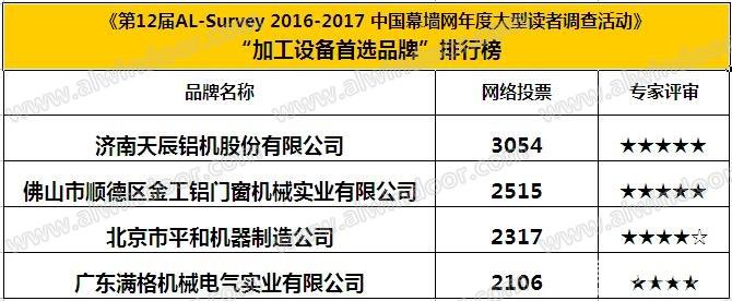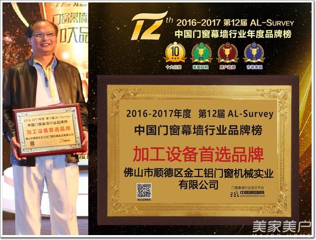 此外,在全国铝门窗幕墙行业年会其间,还举行了由中国建筑金属结构协会主办,中国幕墙网ALwindoor.com承办的“第十二届AL-Survey2016-2017中国幕墙网年度大型读者调查暨‘我最喜爱幕墙工程’评选活动”的颁奖仪式,该活动自2005年创立以来,迄今已连续举办12届,坚持“没有黑马,实至名归”的评选风格,已成为广大房地产开发商、设计院以及行业专家、顾问咨询公司等读者群体进行品牌选择和产品选购的重要参考依据。而每届的“我最喜爱幕墙工程”评选,更是以其“新、奇、高、大”的入围标准,被喻为“鲁班奖”的前哨站,而金工机械亦不负众望,以2515票斩获加工设备类首选品牌大奖。