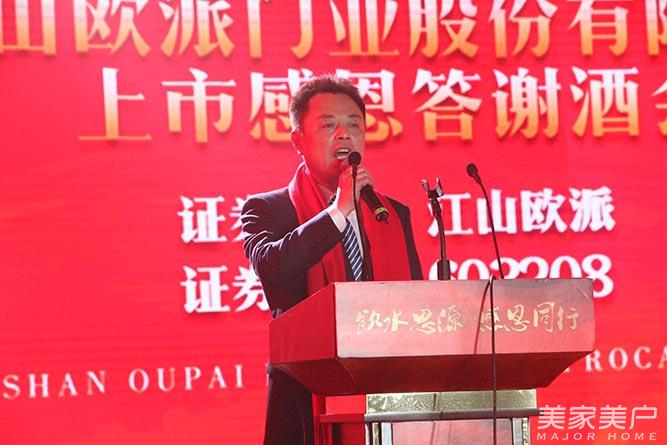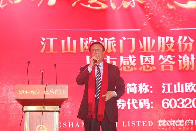 会上,江山欧派门业董事长吴水根发表致辞。他表示,江山欧派门业能够成为木门行业第一家上市A股的企业,离不开大家的信任与支持,江山欧派门业更应该心怀感恩,感谢江山政府对江山欧派门业的支持,感谢江山欧派门业所有同仁们的辛勤付出,感谢社会对欧派的大力支持与认可。未来,江山欧派门业还有很长的路要走,也会不忘初心,更加务实努力。