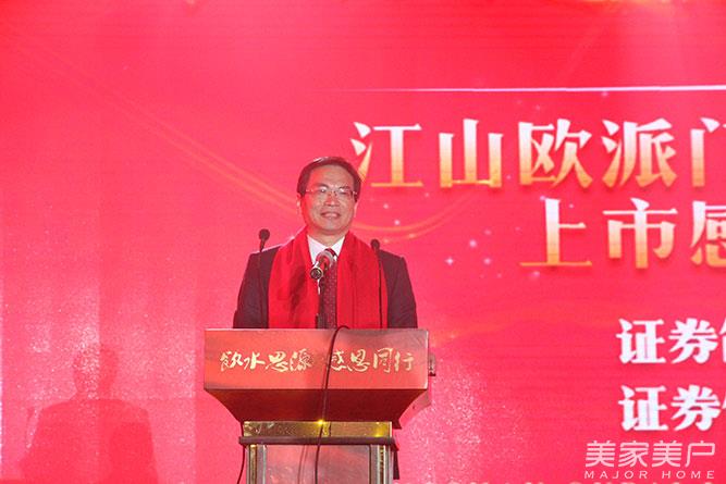 接下来,江山市委吕跃龙书记发表讲话。他感恩大家的到来,一起分享江山欧派门业上市的喜悦,祝福江山欧派门业拥有更好美好的未来,作为江山政府人员,为江山欧派门业感到骄傲。作为江山木门的龙头企业,江山欧派门业为江山提供了更多的就业机会,带动了一大批的创业企业,为江山经济的发展做出了巨大贡献。