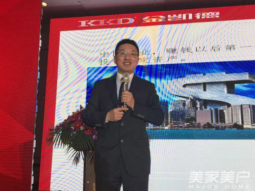 金凯德集团执行总裁董小锋首先登场,从“品牌高度”和“构建唯一”等方面展开讨论,进而引出金凯德集成2,0战略——“高度构建第一,角度构建唯一”,致力于成为引领行业科技水平,紧跟时代美学潮流的家居标杆企业。