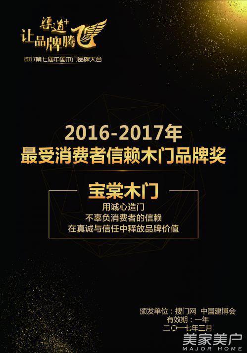 宝棠木门荣获“2016-2017最受消费者信赖木门品牌奖”