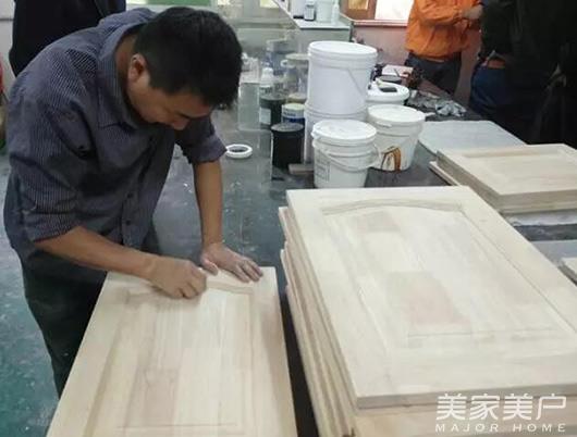 漆强化工销售经理马金昌向朝鲜郑社长讲解木器漆样板