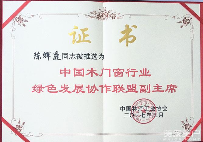 陈辉庭被授予“中国木门窗行业绿色发展协作联盟副主席”证书