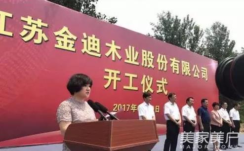 6月20日,在江苏泗阳的洪泽湖畔,阳光灿烂。金迪集团江苏金迪木门股份有限公司千亩木门工业园区举行开工仪式。中国木材与木制品流通协会木门窗专委会会长张国林,浙江金迪控股集团董事长王永虎、总裁王玲娟,浙江省门业协会秘书长李进,以及泗阳县相关部门负责人出席了活动。金迪集团总裁王玲娟在开工仪式上为金迪千亩木门工业园区开工作了热情洋溢的讲话。