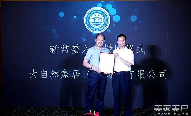 关润开为大自然家居(中国)有限公司授予“广东省门业协会常务副会长单位”荣誉牌