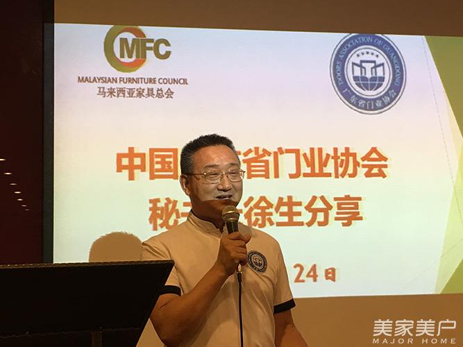 随后,广东省门业协会会长、广东润成创展木业董事长关润开发言。他说:“今天,中国、马来西亚新老朋友相聚在美丽漂亮的吉隆坡,共同见证两地家居行业的成长和发展,增进了解和友谊。2016年10月,马来西亚柔佛州峇株吧辖家具同业公会同仁来到广东,我们进行了探讨交流与合作,也结下了深厚的友谊,此次有幸能够来到马来西亚考察学习。广东省门业协会自成立5年以来,已经发展成为拥有会员企业400多家,并形成国内颇有影响力的行业组织。广东拥有定制家居、木门、铝合金门窗、钢质门、锁具五金、涂料配材、机械配件等逾3000家,产值估算千万亿元,广东省门业协会有效的整合了上、下游产业链资源优势,将打造国内最强大的门窗与家居产业链平台。马来西亚同仁勤劳善良、热情好客,这里有着丰富的木材等资源,也有着很好的家居消费市场,为我们有更多的合作奠定了坚实的基础,希望我们双方在技术、资源上有更多的合作交流,在适当的时候再次邀请马来西亚家具同业公会同仁莅临广东实地考察。”