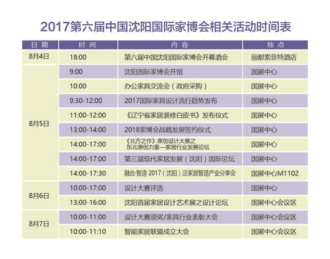 2017第六届中国沈阳国际家博会是中国北方规模最大的家居专业盛会,总规模为12万平,700家国内外企业参展,展会设有精品套房家具馆、沙发床垫软体家具馆、客厅餐厅家具综合馆、办公家具及原辅材料馆、定制门品馆、全屋定制馆、定制·装饰·建材馆、木工机械馆八大展区。