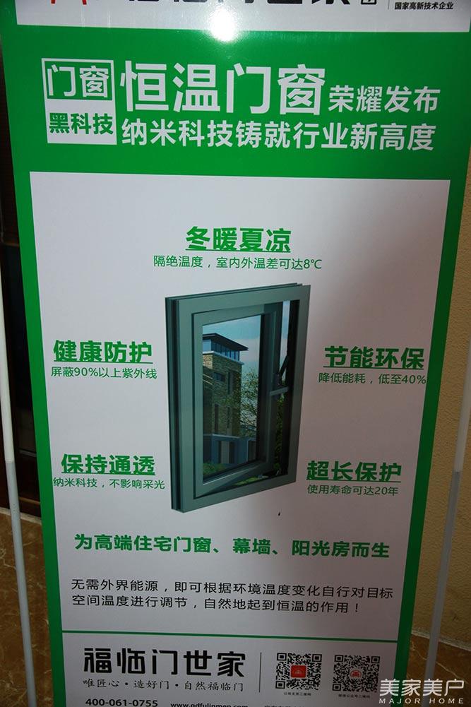 此外,恒温门窗还对门窗的密闭性(受门窗气密性、水密性和门窗组件之间的缝隙影响)有较高要求,即气密性达到6级,水密性达到8级以上,门窗胶条采用汽车天窗胶条。以上七项指标同时满足才能成为恒温门窗。恒温门窗为门窗行业首批国家高新技术企业、恒温门窗国际标准的提出者——广东福临门世家智能家居有限公司(以下简称“福临门世家”)首创。该产品引进国际最先进原材料,利用国外先进技术,与国家纳米科学中心(北京)、纳米技术及应用国家工程研究中心(上海)进行合作,在深圳大学纳米材料研究实验室研发。福临门世家首创的恒温门窗具有节能环保、阻隔红外线、抗紫外线、高透光率、无拼接缝、阻燃性好、耐用性久、经济适用等优势。恒温门窗是福临门世家响应消费升级趋势以及国家对节能减排的号召,创新性开发的一款专利产品,它将门窗行业的技术和消费者的使用体验带到新的高度。