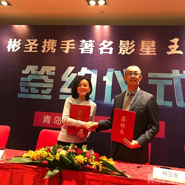 青岛彬圣整木家居董事长刘宝东与著名影星王琳在签约仪式上