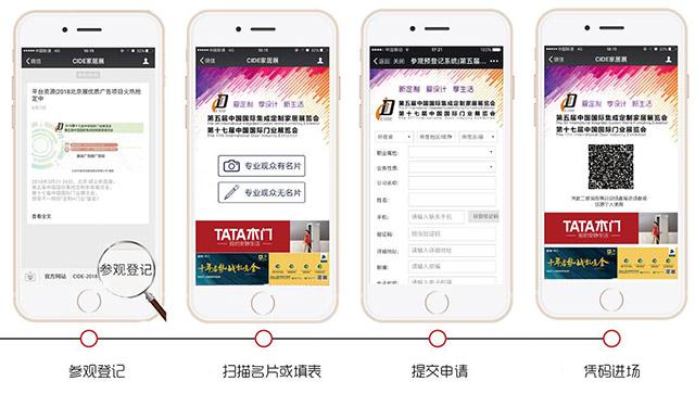 → 扫描名片或填表 → 提交申请→凭生成二维码进场