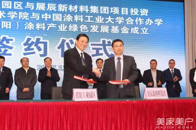 2017年12月11日,濮阳工业园区管委会主任刘普军与展辰新材料集团股份有限公司董事长陈冰签订项目投资协议,展辰集团投资10.5亿元人民币的涂料生产项目正式落户濮阳工业园区。濮阳市长宋殿宇、濮阳市委书记何雄、中国涂料工业协会会长孙莲英、展辰集团副董事长陈寿生、广东涂料行业协会秘书长吕水列、广东涂料行业协会副秘书长李江宁等领导嘉宾共同见证了签约仪式。