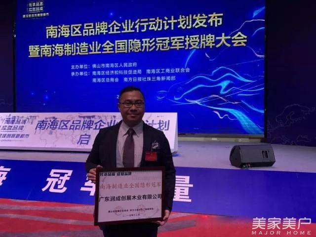12月5日,由佛山市人民政府主办、南海区经济和科技促进局、南海区工商业联合会、南海区总商会、南方日报社珠三角新闻部承办的“南海区品牌企业行动计划发布暨南海制造业全国“隐形冠军”授牌大会”在佛山千灯湖酒店隆重召开,会议上,南海制造业全国“隐形冠军”企业推荐名单正式发布,其中广东润成创展木业有限公司凭借着在行业中非凡的影响力、卓越品牌定位及优质服务等强大优势位居行业榜首,荣获“隐形冠军”称号!