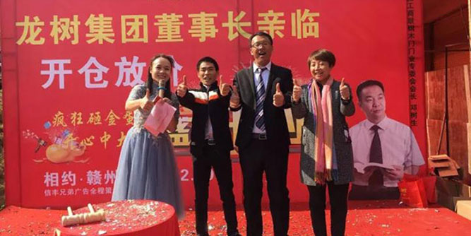龙树集团董事长邓树生及副总裁赵春荣带领营销团队一起参加了信丰龙树旗舰店开业活动。董事长邓树生希望在信丰龙树旗舰店林总的带领下,以诚信经营,服务信丰为宗旨,将龙树门越做越大。他强调只要全国龙树家人们能够紧跟龙树的脚步,开拓思想,锐意进取,一定能够把龙树这个品牌做得更大更强,带给全国人民满意的产品,周到的服务。