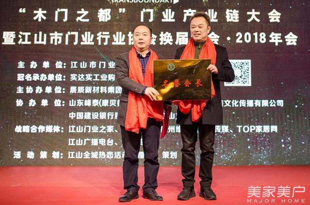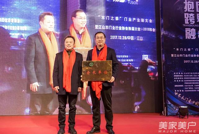 上一任会长江山欧派吴水根为新当选会长王牌门业何利明授牌