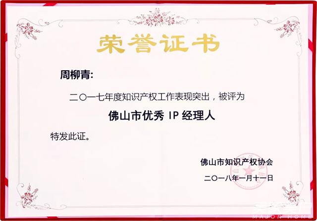 本次表彰由佛山市知识产权协会联合企业资深知识产权专家,围绕企业知识产权管理规章,专利人员配置,专利申请与授权、运用,商标申请等共同评定。该项评选是佛山知识产权行业最具权威性的评选。评选过程非常严格,历经层层筛选,全面认定,含金量非常高。